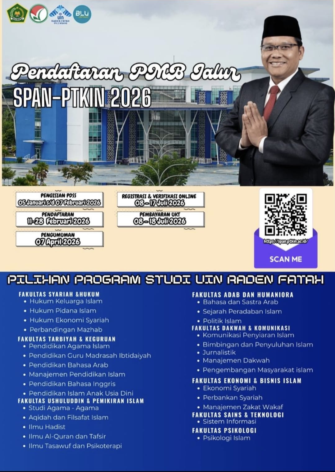 UIN Raden Fatah Palembang membuka pendaftaran mahasiswa baru melalui Jalur SPAN-PTKIN 2026, yaitu seleksi nasional berbasis prestasi akademik bagi siswa MA/SMA/SMK sederajat.